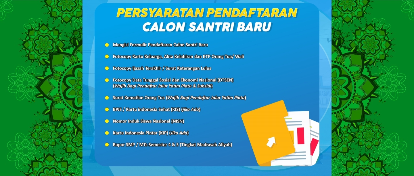 - Fotokopi Kartu Keluarga (KK), Akta Kelahiran dan KTP Orang Tua atau Wali Santri